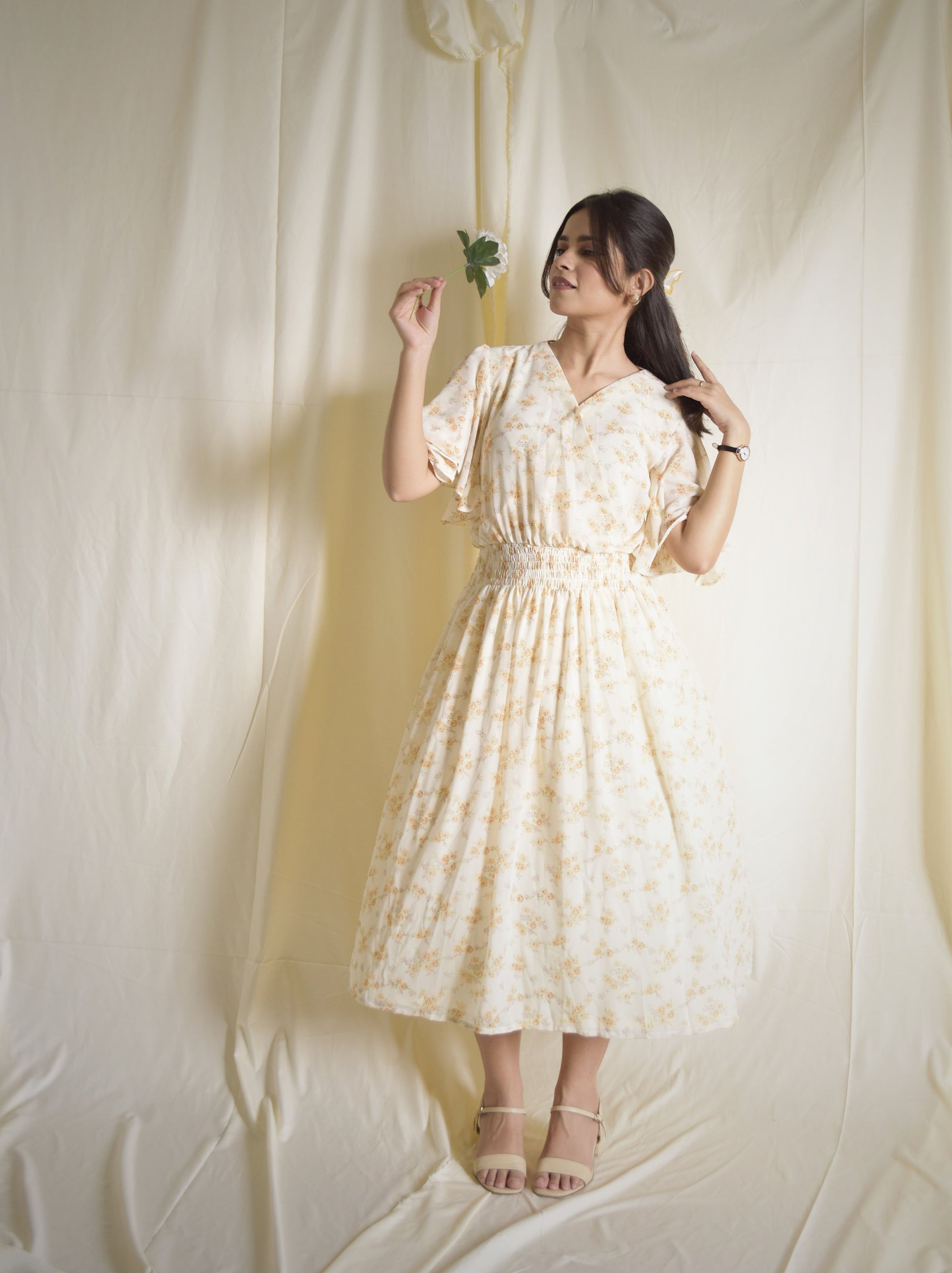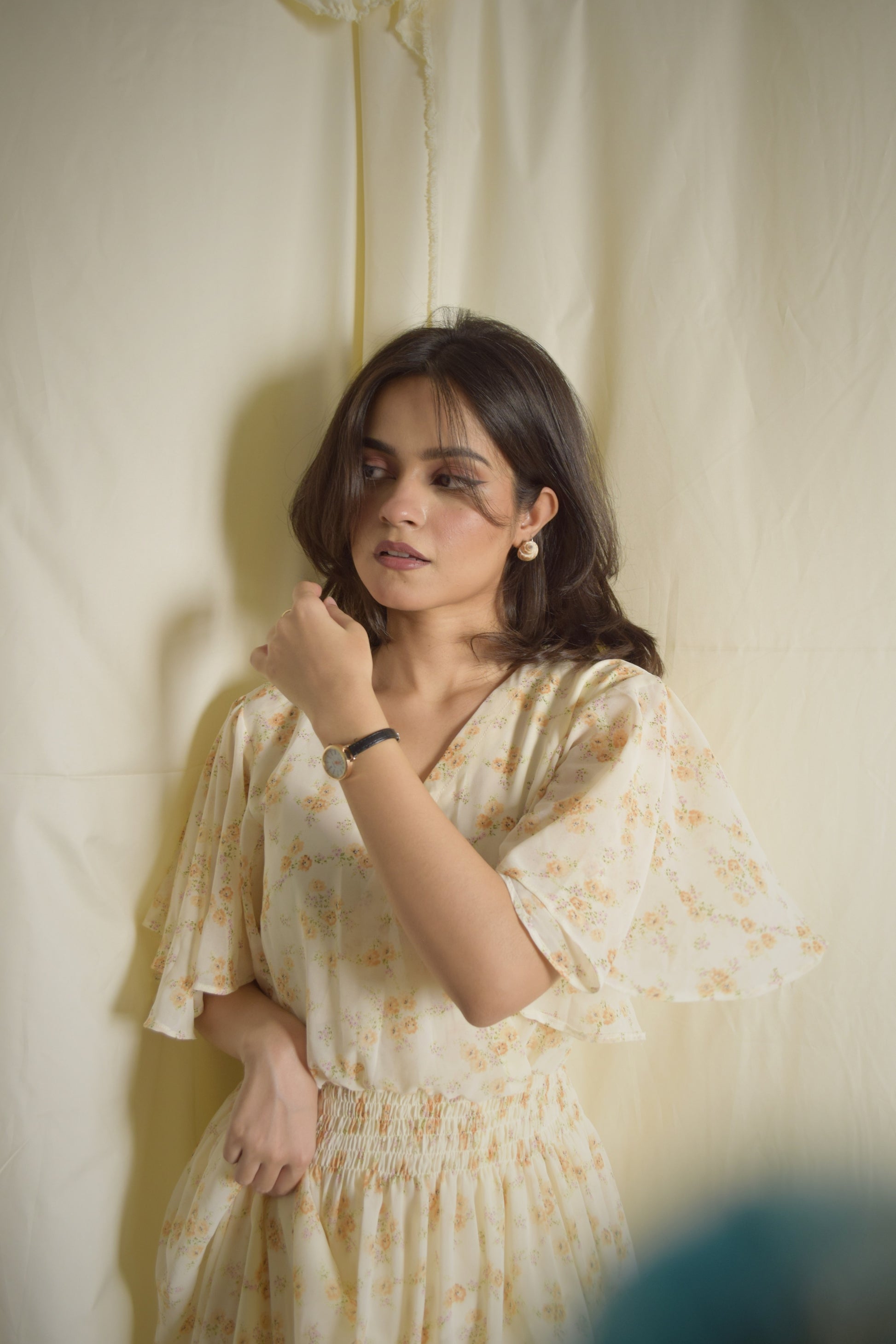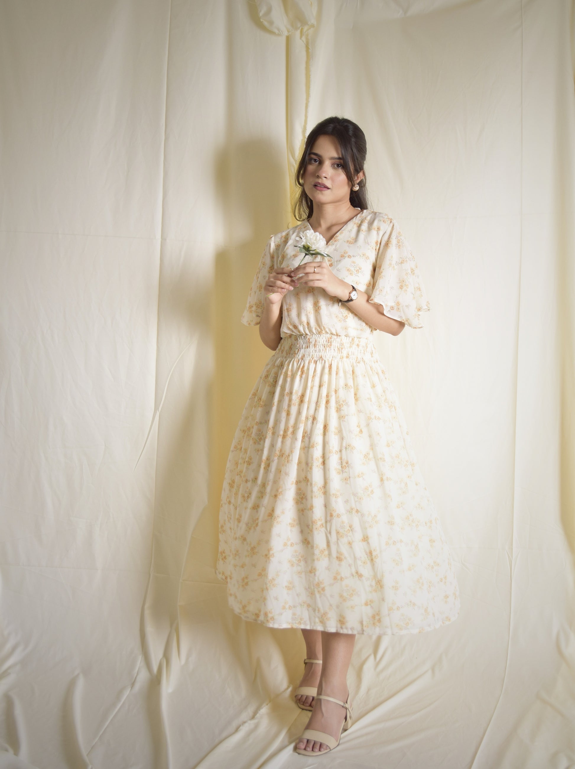 Printed dress with smocked waist and ruffle sleeves with frill detail. Floral maxi dress featuring true Victorian vibes with a V neck design, ruffled sleeves and side waist detailing like never before!! Made with Chiffon with stitched inner, we're confident you can steal any spotlight with our beautiful design at any event.