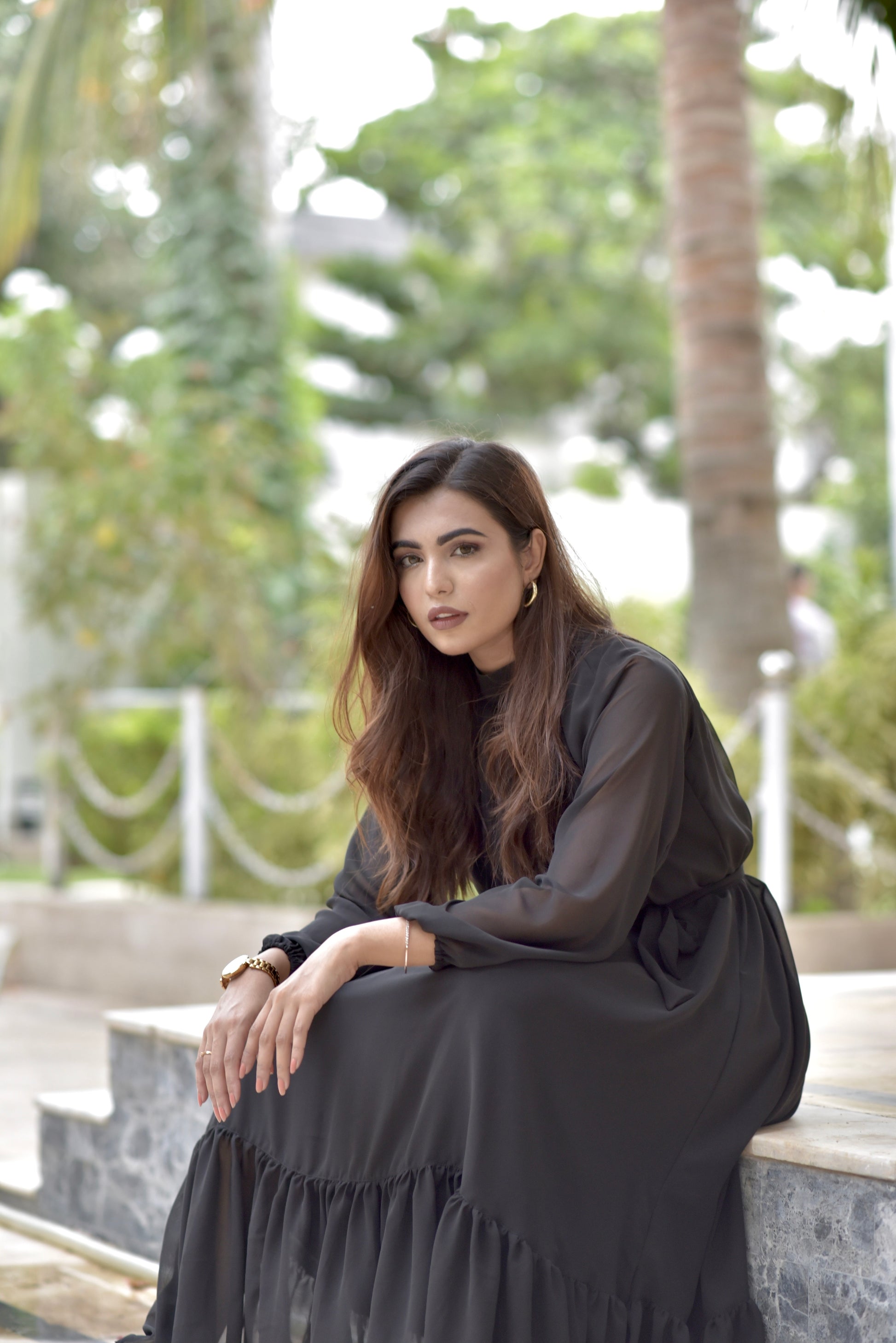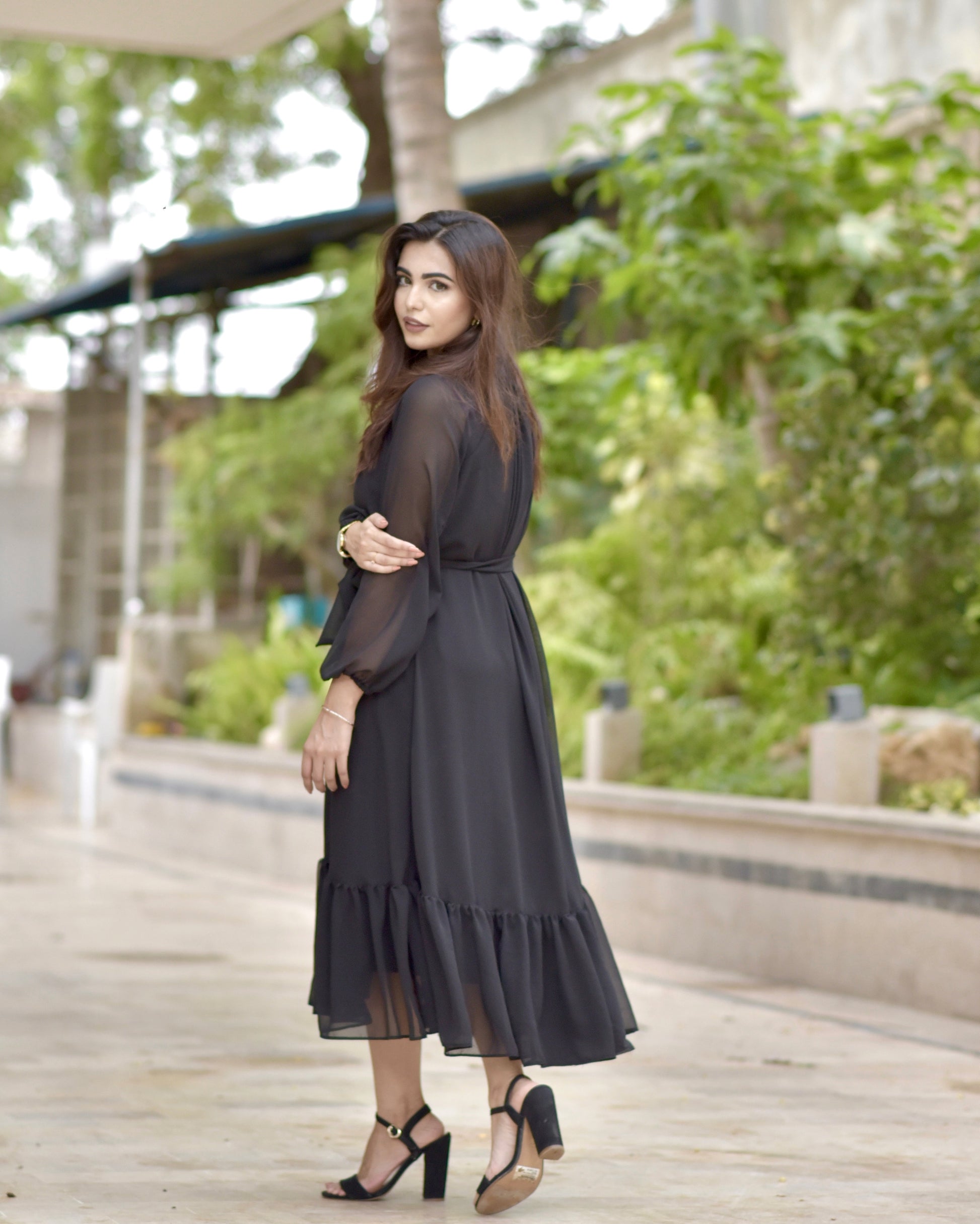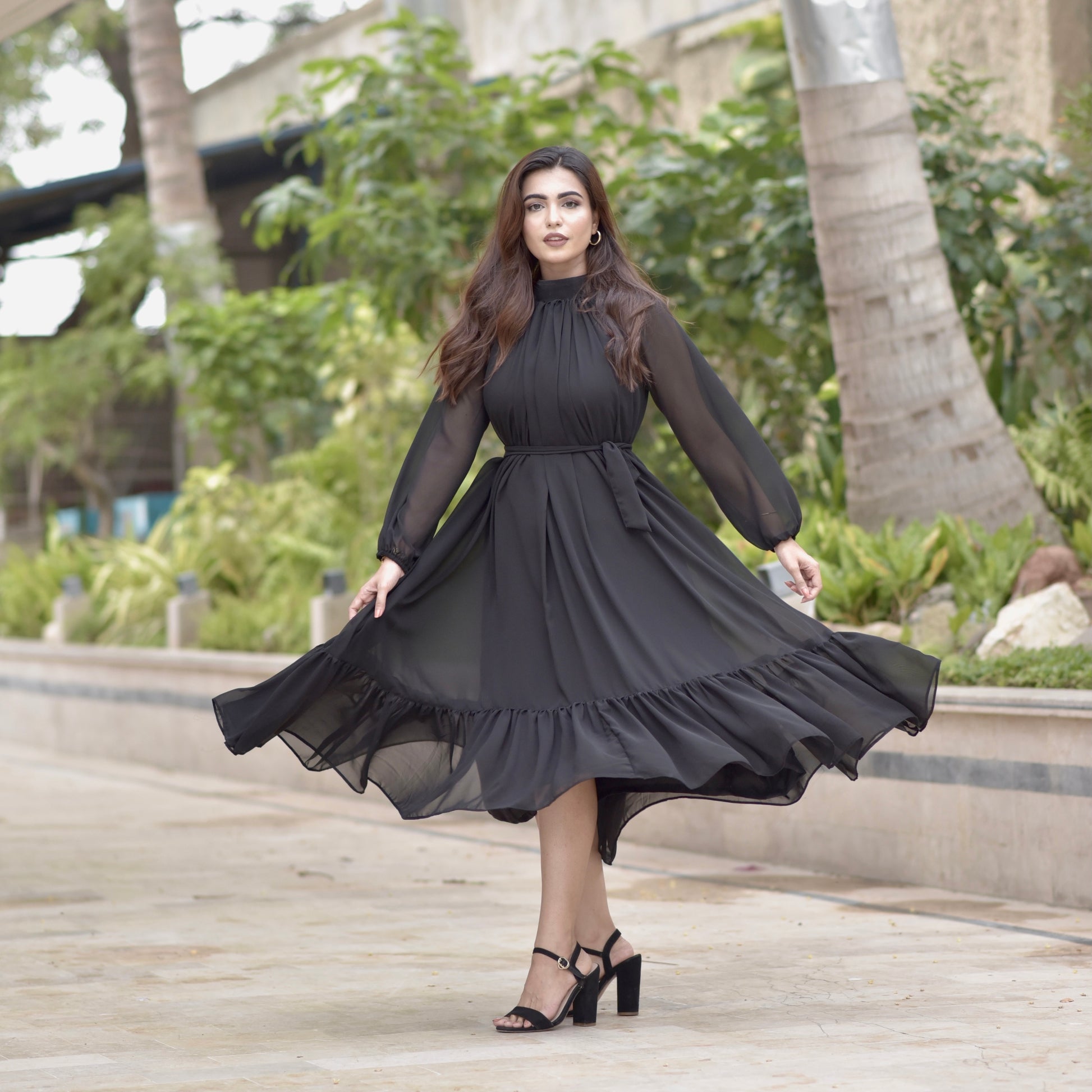 High-neck detailed chiffon dress, with a belt and a frilled bottom.