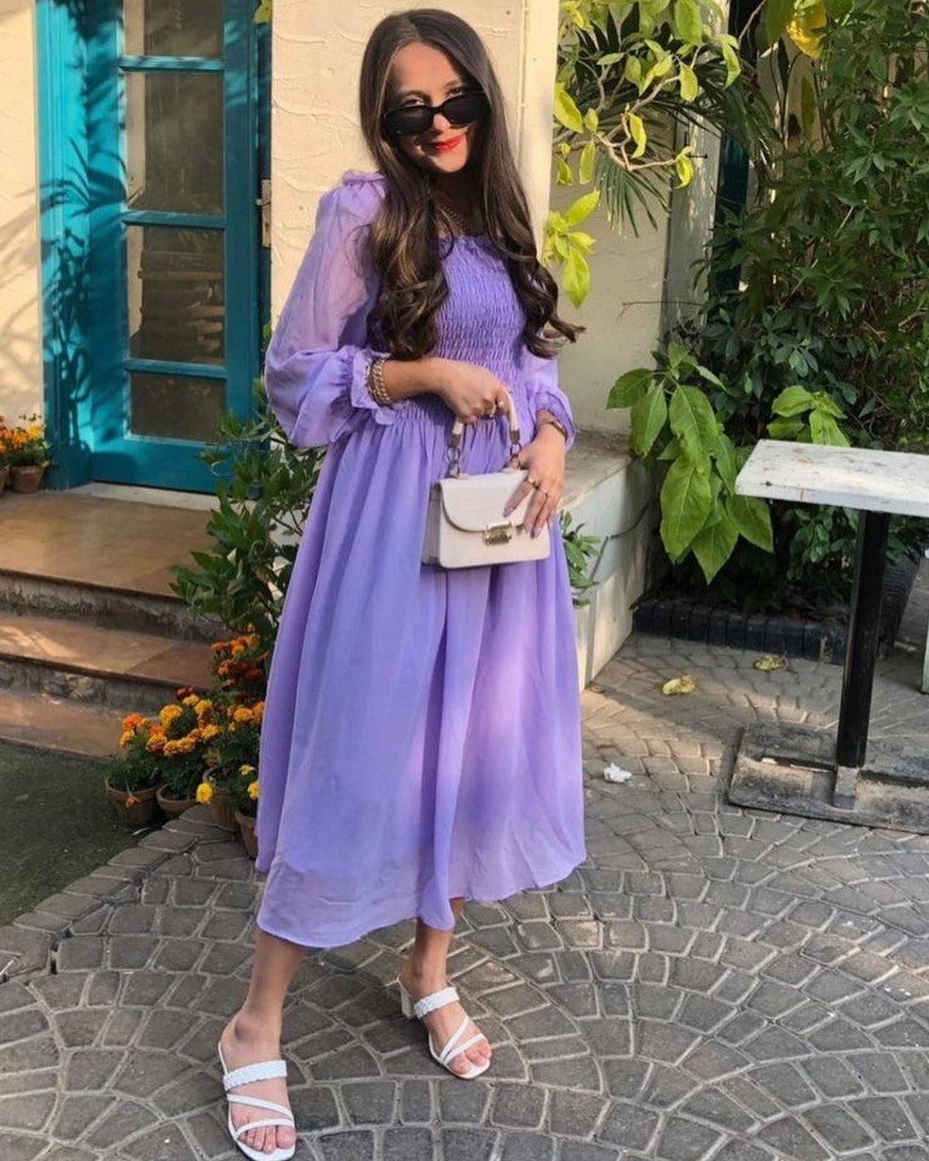 Smocked dress made out of soft, chiffon fabric with shirring detail and attached lining.