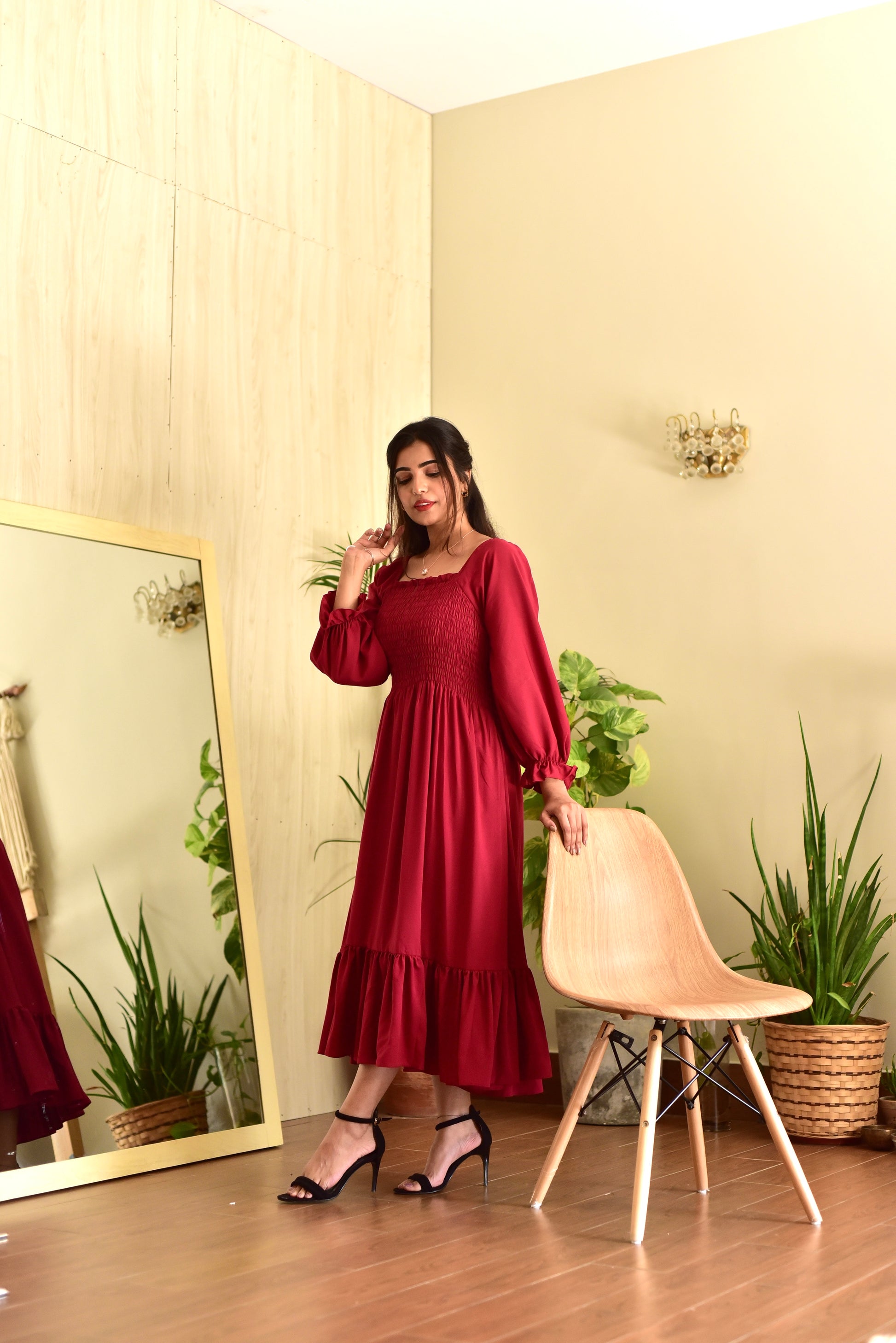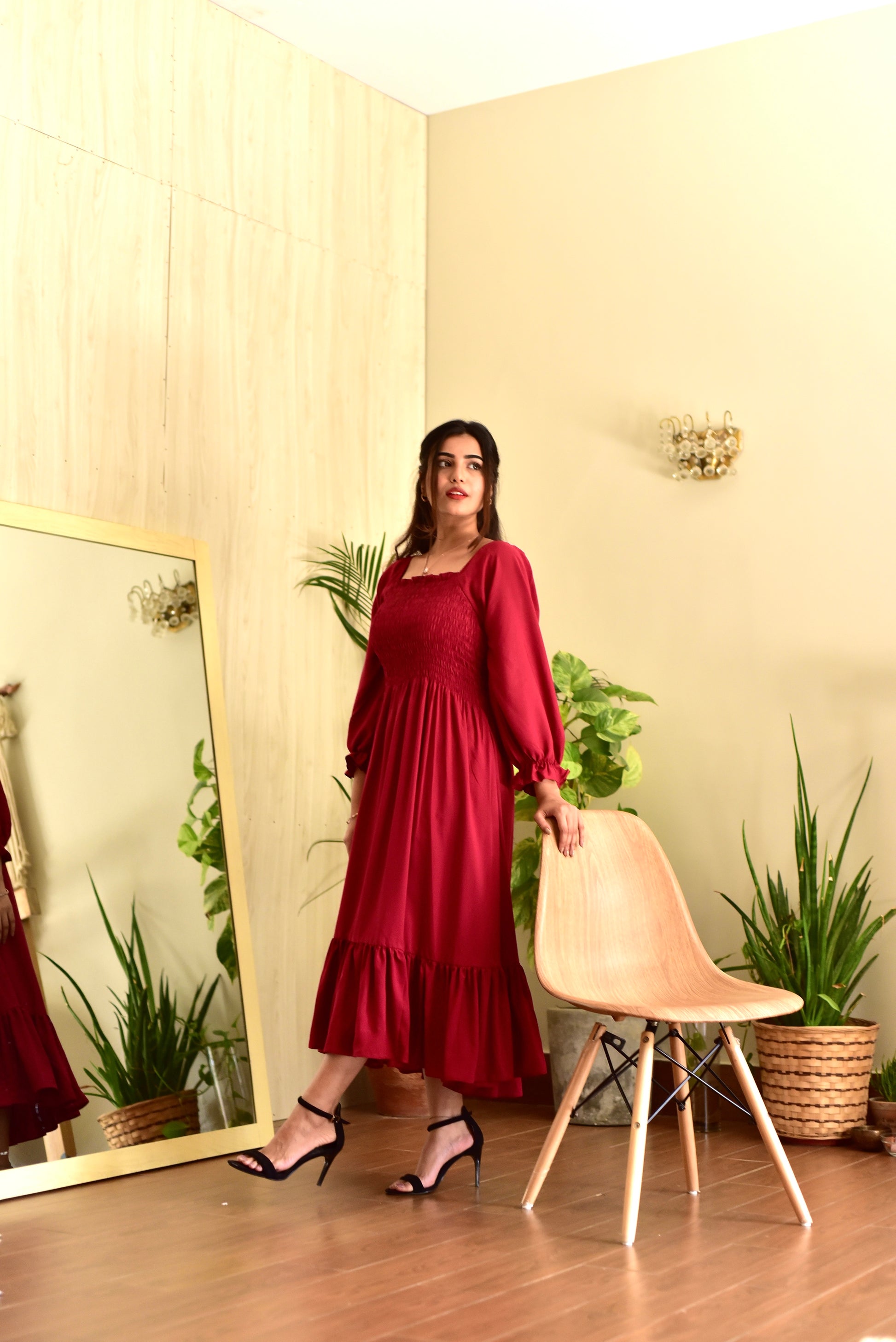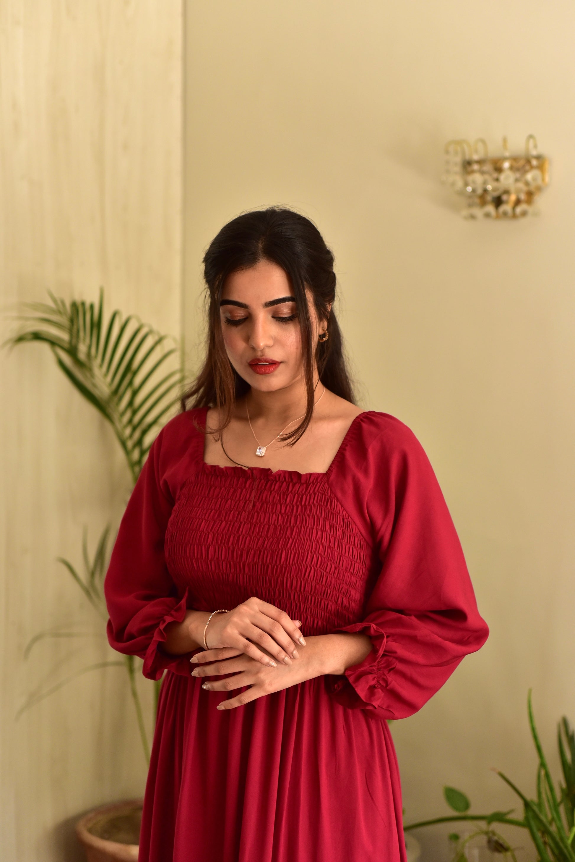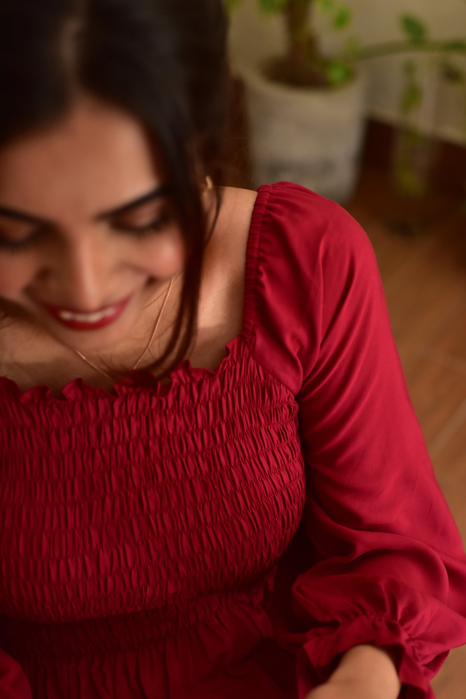 Smocked dress made out of soft, linen fabric with shirring detail.